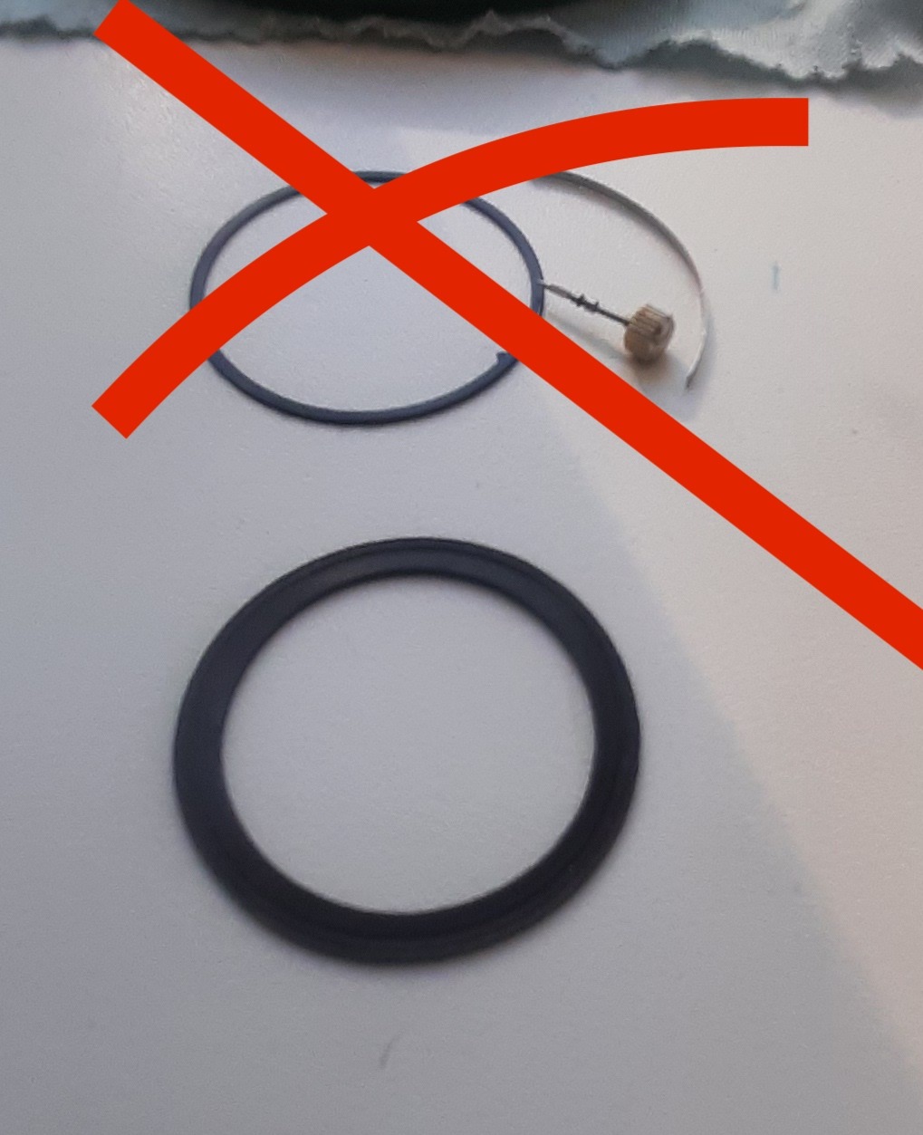 Видим что выбросим а внизу прокладка новая которая не зачеркнута поставим в корпус и затянем кольцо и не будет болтаться ничего. Заводной вал а точнее шляпка не родная , и поэтому не было втулки в корпусе а она должна быть но не буду описывать для чего и так далее. Поставим другую втулку родную от Полета с нормальной шляпкой пусть даже и не желтого цвета.