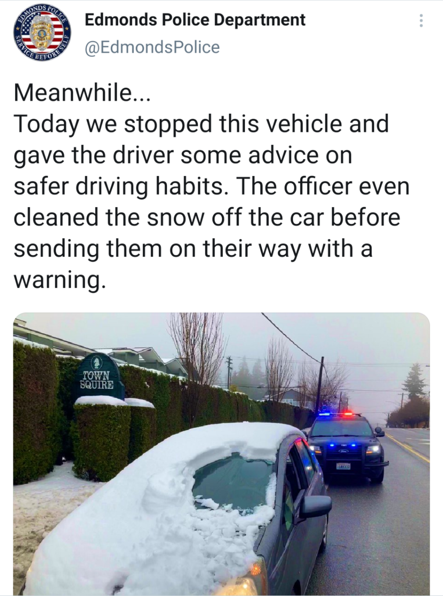 Сегодня мы остановили этот автомобиль и дали водителю совет по поводу безопасного вождения. Офицер даже очистил автомобиль от снега перед тем как отпустить их с предупреждением.