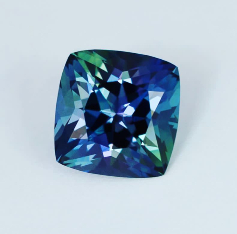 Характерная черта танзанита – трихроизм. Природный камень имеет разницу цвета по трем осям. А вот при нагреве это свойство меняется на дихроизм – разницу в цвете по двум осям.