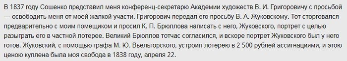 А так получается что из всех переживающих за судьбу крепостного, материально вложился только Брюллов, написавший портрет, и весь гонорар за свою работу отдавший помещику В. Энгельгардту. Не важно, откуда появились деньги за картину – через лотерею либо частным образом, это были его и только его, Карла Брюллова заработок. Все остальные «переживающие» поучаствовали только «на словах».