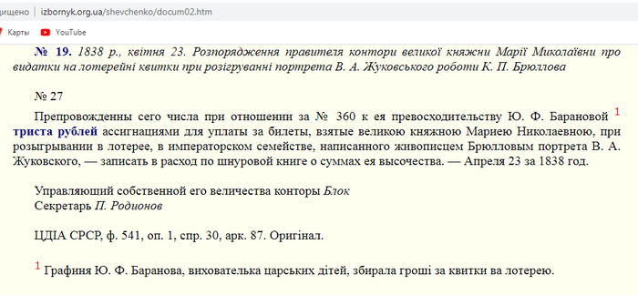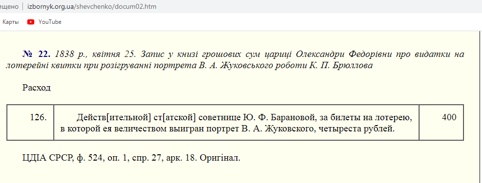 То есть если полковник Энгельгардт не принял вместо денег лотерейные билеты нарисованные графиней Барановой, то ни лотерея, ни императорская семья, ни портрет Жуковского вообще никакого отношения к выкупу Шевченко из крепостничества не имеют. И все это одна сплошная выдумка рассказанная самим Тарасом Шевченко и подхваченная любителями красивых историй.