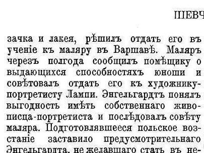 С его слов получается, что какой-то двадцатичетырехлетний крестьянин, еще вчера бывший пастухом, из какого-то захудалого хутора приезжает в Санкт-Петербург и без всякой базовой художественной подготовки, впервые взяв в руки холст и масло настолько гениально начинает рисовать, что затмевает И.К. Айвазовского, С. М. Воробьёва, Жан-Батист Шардена, Этьен Лиотара и сотню других гениальных художников. А Карл Брюллов, в 1838 году, проникнувшись его талантом, решает отказаться от своего гонорара, дабы выкупить Шевченко у полковника Энгельгардта за сумасшедшую сумму.
