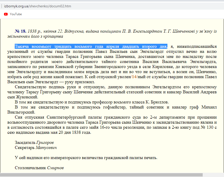 Почему нельзя допустить, что полковник лейб-гвардии Уланского полка – Василий Энгельгардт, внял просьбе В. Жуковского и вольную своему крепостному именно подарил? А историю про свой выкуп, Тарас Шевченко просто выдумал для поднятия своей значимости? Ведь сумма то немаленькая, должны были остаться хоть какие нибудь расписки о получении, передаче. Такие суммы просто так не передаются. Все под расписку, да еще и с нотариусом. Тем более, когда это не личные, а общественные деньги. Но нет никаких упоминаний суммы выкупа ни в нотариальных журналах, ни в бухгалтерских книгах Энгельгардтского казначея.