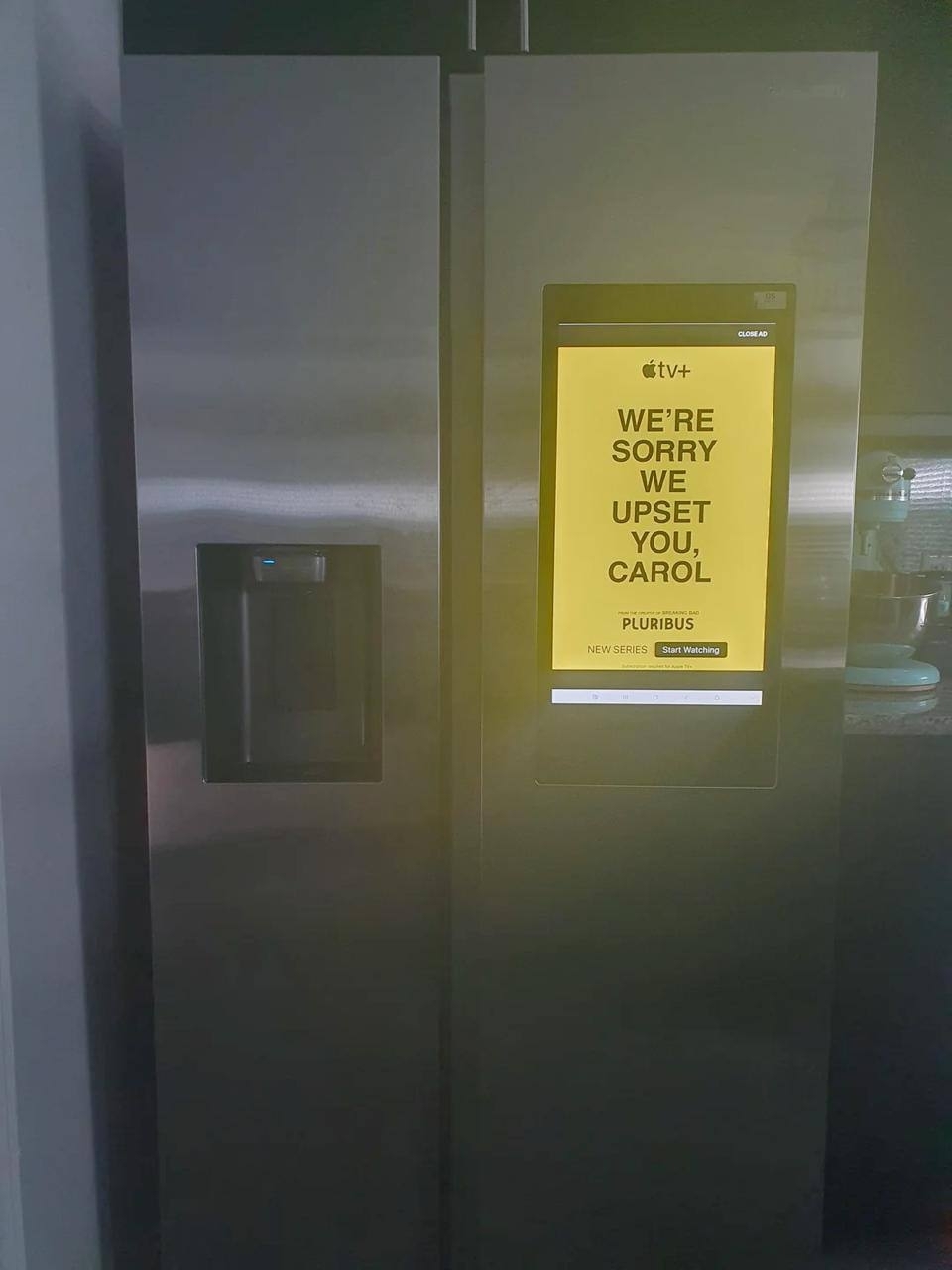 Пользователь Reddit поделился печальной историей — его сестра приобрела новенький холодильник Samsng. После его установки в один момент таргетированная реклама холодильника показала промо нового сериала от Винса Гиллигана и вывела на экран фразу: