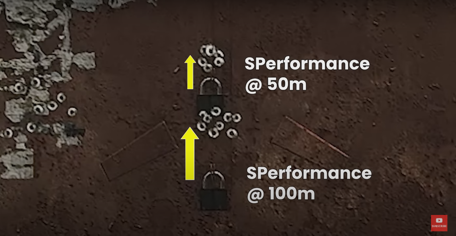 Наглядно: группа, собранная пулями SF при пристрелке на 50 метров на расстояниях стрельбы 50 метров и 100 метров. Игрок целился сначала в верхнюю, а затем в нижнюю чихуйнюшку на воротах соответственно.