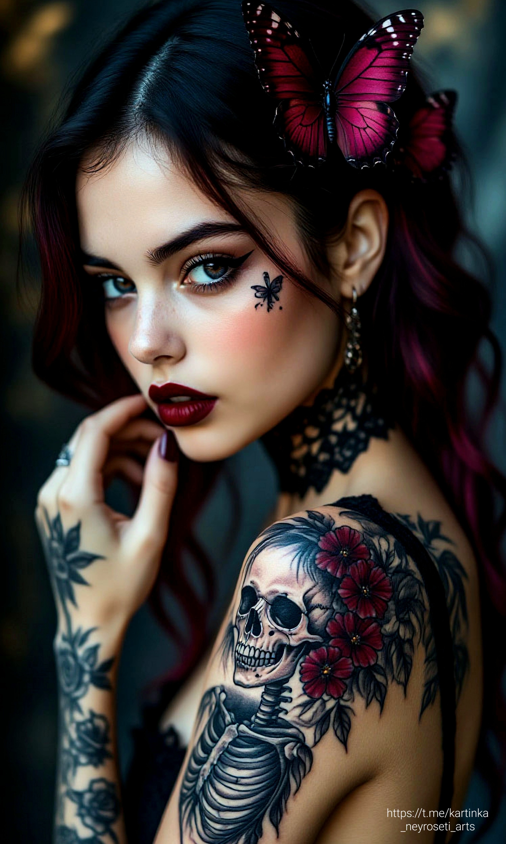 ArtKabachok Тату 3 месяца назад [моё] Тату Девушка с тату Эскиз татуировки Череп Бабочка Готика Нейронные сети 1 Ещё 0