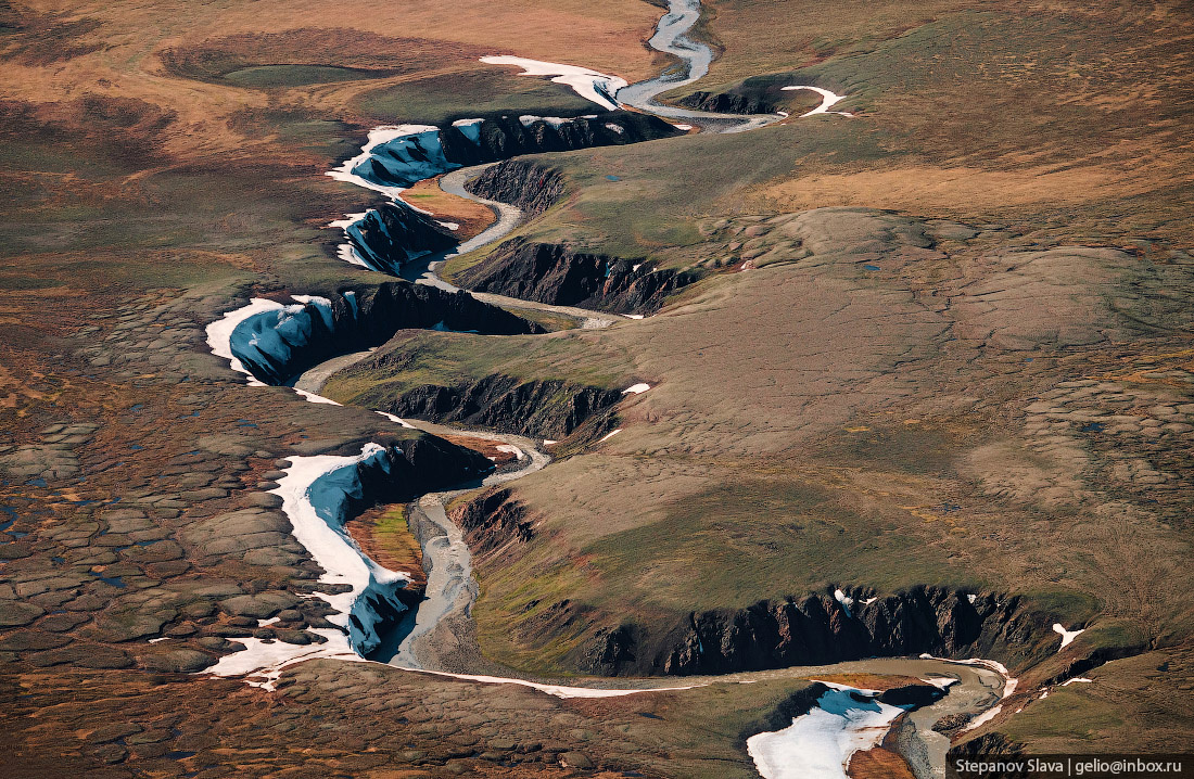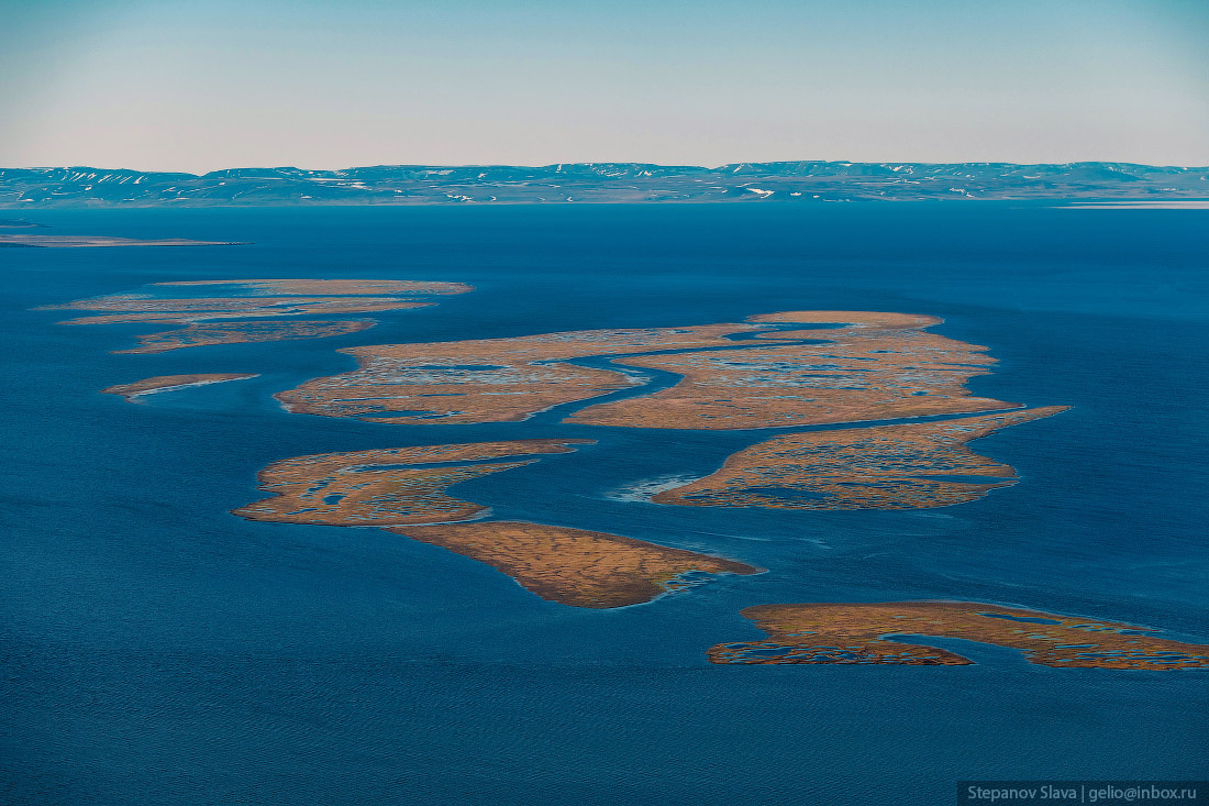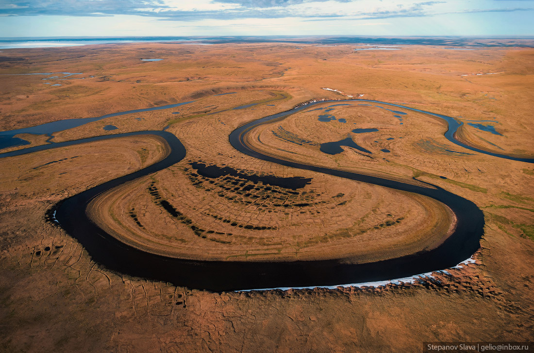 Полигональный болота Таймыра. Учёные считают, что причудливая форма получилась из-за постоянного чередования циклов таяния и замерзания верхней части вечной мерзлоты — это вызывает эрозию на поверхности. Почва из трещин выталкивается наверх и образует валики, на которых летом появляется растительность. А в низинах между валиками скапливается вода. Так поверхность покрывается многоугольниками — полигонами. На валиках часто встречаются оленьи тропы — стада мигрируют по ним, как по дорогам на юг и север.