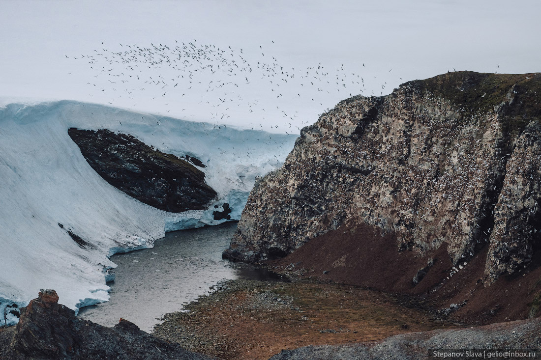 Птичий базар на реке Унга. На Таймырском полуострове многие виды птиц проводят около четырёх месяцев в году. В это время проходят все их главные жизненные циклы — размножение, воспитание молодняка, подготовка к отлёту на места зимовок.