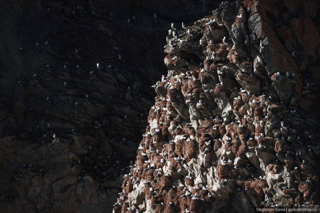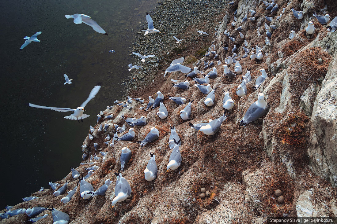 Птичий базар на отвесных скалах реки Унга. Чайки гнездятся здесь на практически вертикальных поверхностях, некоторые гнеёда расположены вплотную друг к другу.