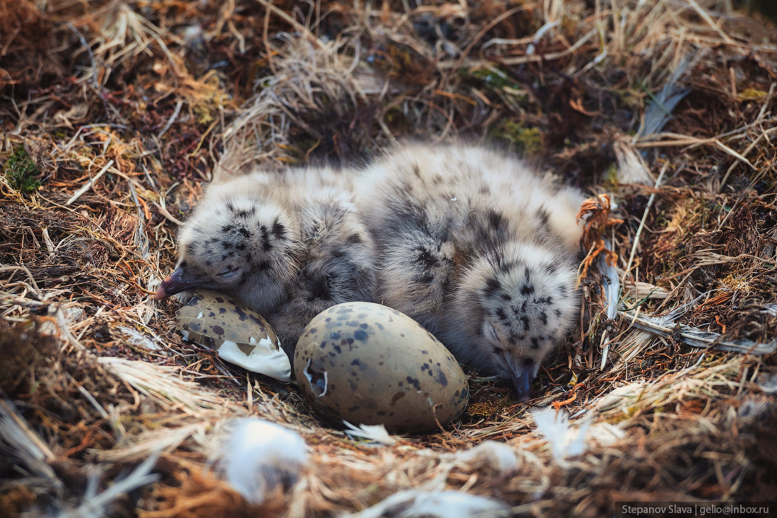 Вылупившиеся птенцы чаек. Обычно у чаек полувыводковые птенцы — они покрыты серым пухом с пестринами, что помогает им оставаться незамеченными. У других видов птенцы выводкового типа — они вылупляются почти сформированными и через несколько часов покидают гнездо и прячутся на воде.