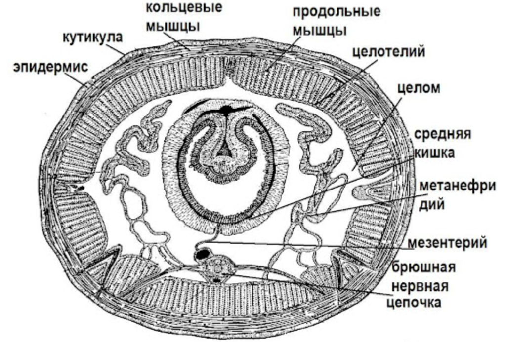 Это поперечный разрез червя. И все указанные на нём органы и ткани червь в состоянии восстановить с нуля. Но вот половые органы и центральный ганглий регенерации не поддаются.