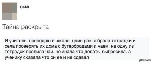 "Я учитель физкультуры с 20-ти летним стажем. Каждый раз во время урока с 9-10 классами заставляю учеников делать разминку, а потом - свободные игры с мячом. Пока ученики играют, ненадолго выхожу, пробираюсь в раздевалку и нюхаю вещи девочек и носки мальчиков. Иногда ворую носок на память, а ученики думают что спиздили одноклассники"