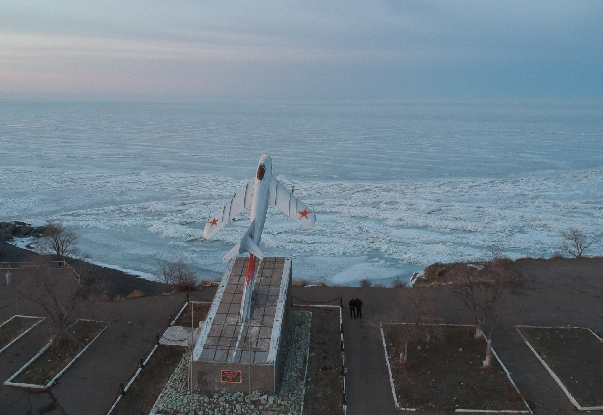 И бонусом памятник воинам авиаторам приозерского гарнизона на фоне покрытого льдом озера Балхаш.