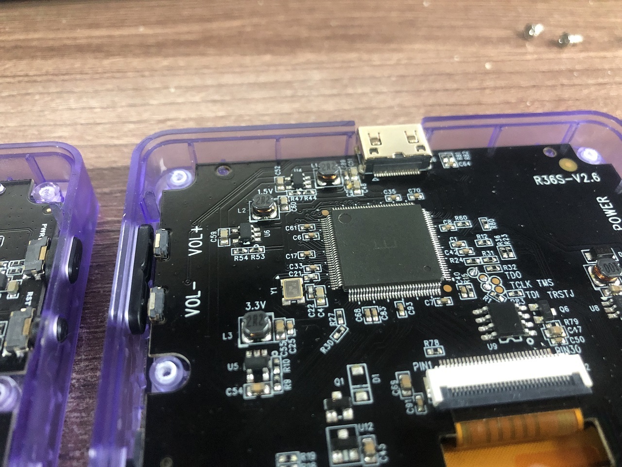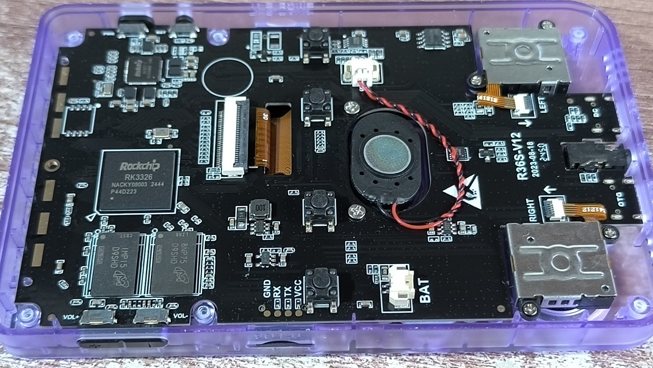 Однако даже если вам попалась ревизия на RK3326 — это не повод сразу же радоваться. Дело в том, что на маркетплейсах продаётся ещё одна вариация R36s (предположительно просто другая ревизия), где объём оперативной памяти сокращен вдвое — с 1ГБ до 512МБ. Её можно опознать и без разборки устройства: если у вас версия с прозрачным корпусом, то один чип памяти - прямой признак «клона».