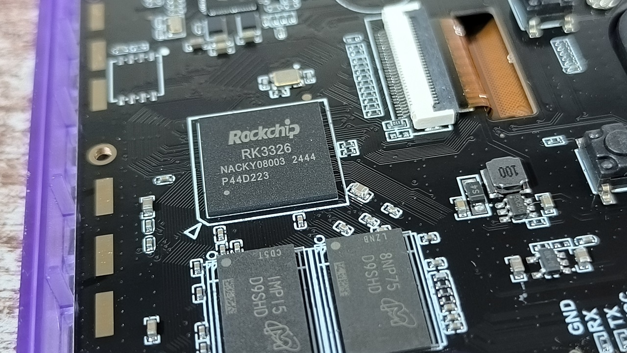 В качестве сердца устройства, здесь выступает чипсет Rockchip RK3326, который состоит из четырех ядер Cortex-A35, работающих на частоте до 1.5ГГц, видеоускорителя Mali-G31 с поддержкой Vulkan, а также контроллеров различной периферии — SPI, I2C, UART и MIPI. В тандеме с ним работают два чипа DDR3-оперативной памяти Micron D9SHD (MT41K256M16TW-107), каждый объёмом в 512МБ. Как и в случае с клоном, постоянной памяти у устройства нет — предполагается использование двух MicroSD карт памяти: первая с системой и встроенным паком игр, а вторая — на усмотрение пользователя.