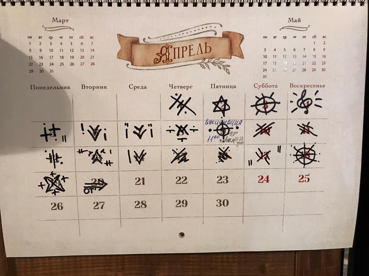 shirmanchik163 Тайна соседа 4 года назад У соседа висит календарь, в котором он рисует загадочные символы. Взываю к силам Пикабу для разгадки. П.с. На вопрос - что они значат?Ответ: раньше были отрывные календари, было удобно а теперь вот.Иначе говоря, прямой ответ получить не удалось. Соседи Загадка Календарь Ещё 0