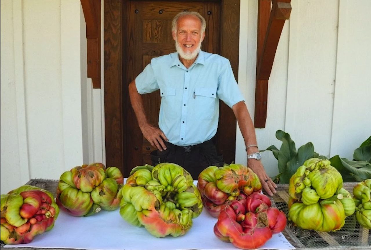 На первом фото вы можете увидеть Дена Сазерленда и его томаты. Вы, возможно, подумали, что это что-то непонятное и уж точно не томаты. Но я вас уверяю, это именно томаты. Речь пойдет не о красоте, не о практичности, а о чистом спортивном интересе и научном любопытстве, впрочем, как и всегда!