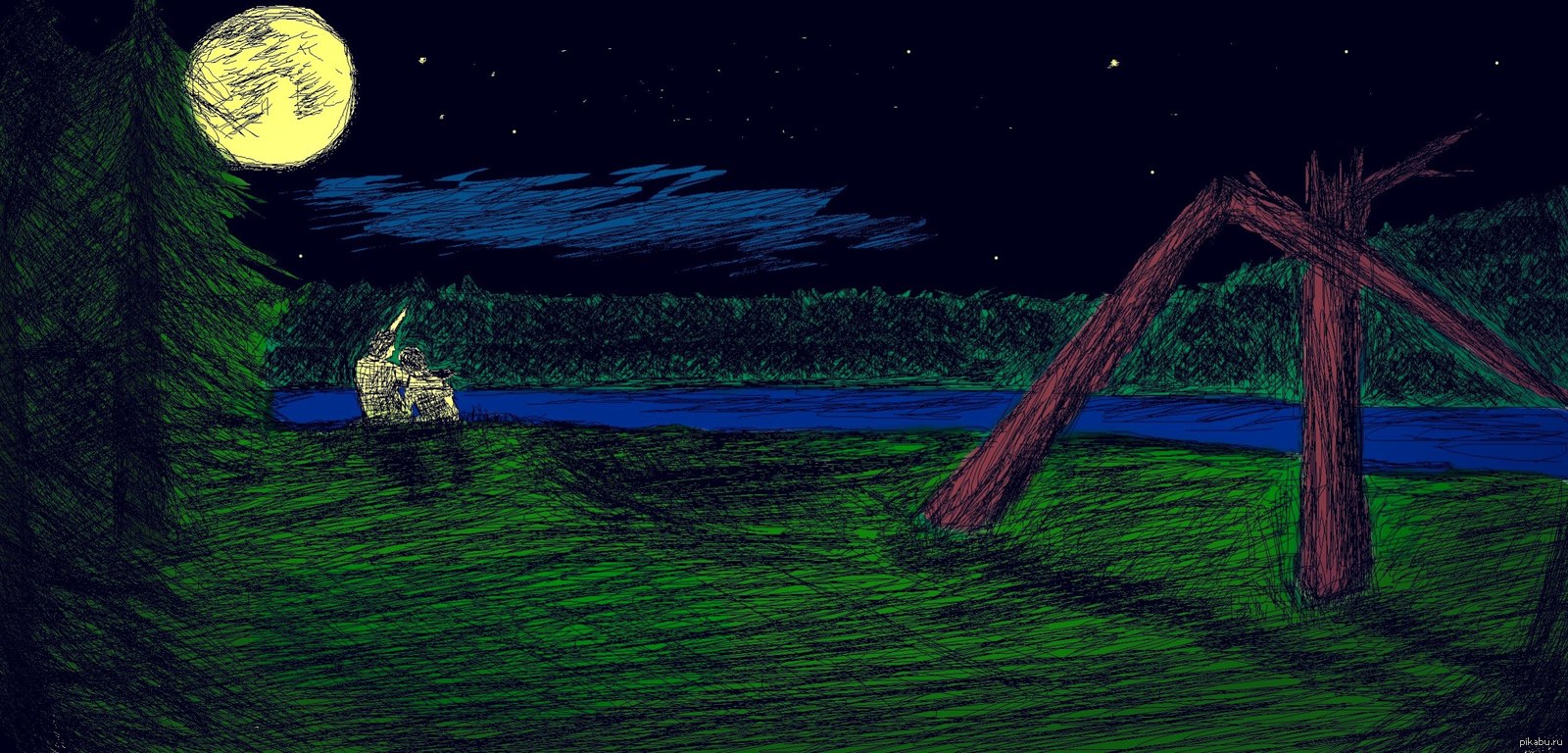 9 AdminBanana Тайное место 10 лет назад Нарисовал сам с помощью paint.net. Оцените, пикабушники)) [моё] Ночь Арт Paint Луна Лес Озеро