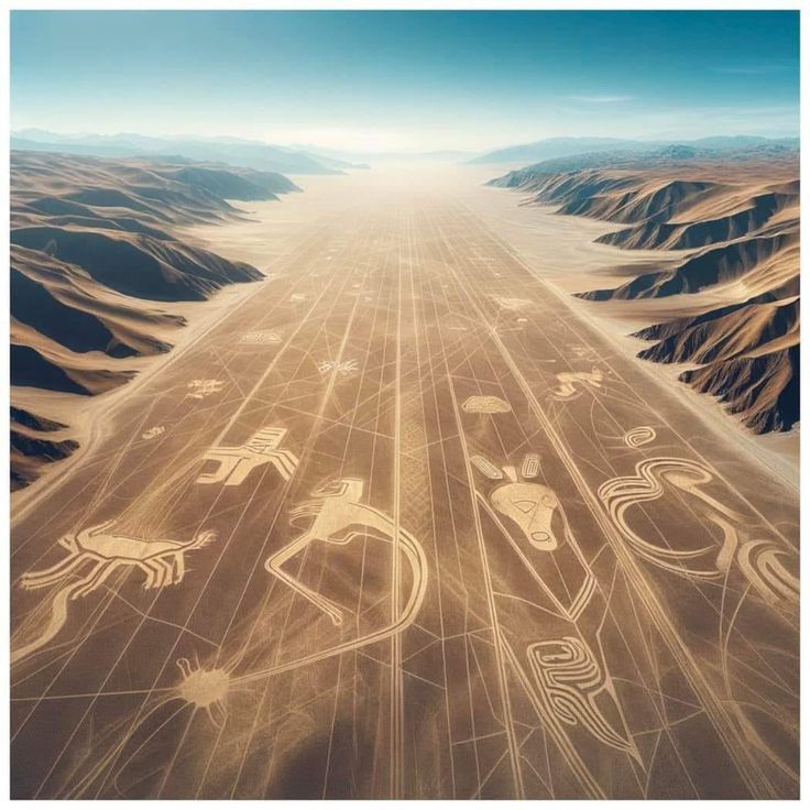 На земле нанесены гигантские рисунки животных, людей и геометрических фигур, видимые только с воздуха.