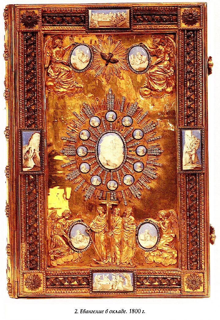 Кто из посетителей Оружейной палаты не обратил внимания на витрину, где выставлены великолепные образцы русского классицизма? Среди них выделяются два крупных Евангелия, заключенные в массивные оклады, которые сразу привлекают взгляд своей четкой стилистикой. Здесь проявляется строгость композиционного решения, ясность линий декора, геометрическая форма накладок, а также ненавязчивая позолота, которая прекрасно подчеркивает живописную эмаль. Особенно выделяется оклад 1800 года с эмалями в серых и голубых оттенках (илл. 2). Этот стиль живописи, который называется гризайлью, был весьма популярен в конце XVIII века, хотя не все заказчики оценивали его: некоторые считали его слишком холодным для своих нужд. На подтверждение этого мнения можно привести оклад на Евангелие 1807 года, также представленный в этой витрине (илл. 3). Его декор значительно отличается яркими цветами эмали, что делает его более притягательным, однако аналогичная композиция показана в еще одном окладе, который Ратков создал в 1795 году для кафедрального собора в Туле (илл. 4). Важно отметить, что заказчик, вероятно тульский епископ, не пожалел средств как на книгу, так и на оклад: сам оклад изготовлен из 20 килограммов серебра, а общая масса книги достигает 37 килограммов, что делает ее самой тяжелой в собрании музея.