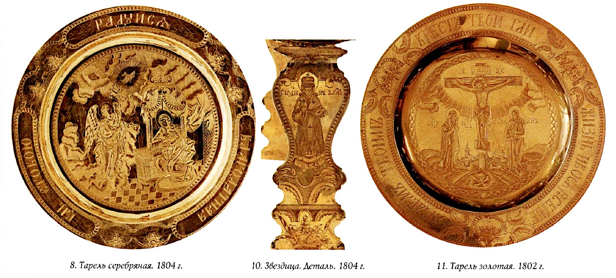 Одним из ярких примеров является золотой литургический прибор 1802 года, который включает в себя две маленькие тарелки с композициями «Распятие» (илл. 11) и «Богоматерь Знамение», а также дискос на ажурном поддоне (илл. 12). Интересная надпись на обороте дискоса указывает, что он был «переделан» из старого дискоса, который был вложен дьяком Иваном Тарасьевичем Грамотиным в Троицкий монастырь. Этот прибор весит 82 золотника, а за изготовление было уплачено 1 рубль 25 копеек за каждый золотник. Понятие «переделан» подразумевает, что для создания нового изделия был использован металл от старой, обветшавшей вещи.