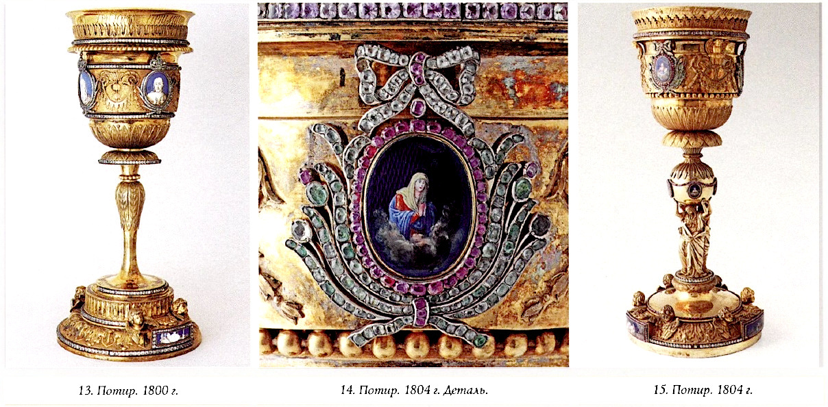 Чеканка в классицистическом стиле имеет низкий рельеф, создающий контраст с яркими дробницами, украшенными серой эмалью на голубом фоне. Чеканный декор дополнен бесцветными стразами, имитирующими бриллианты. Второй потир, созданный в 1804 году (илл. 14), выглядит еще наряднее благодаря наличию более тысячи драгоценных камней, включая изумруды, рубины, альмандины и аметисты.