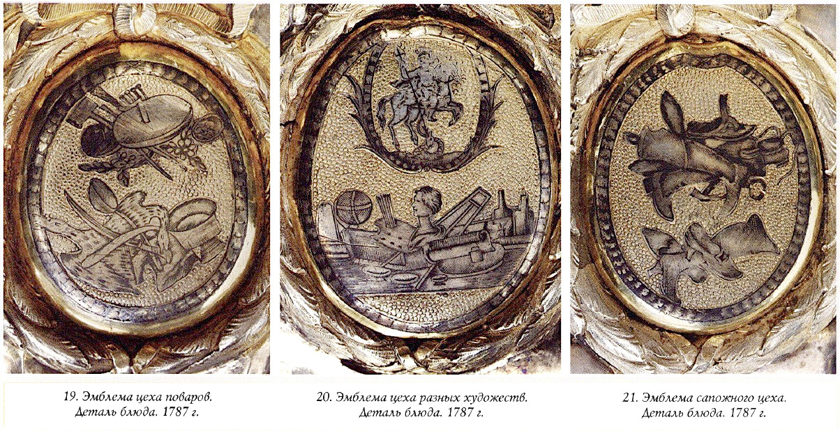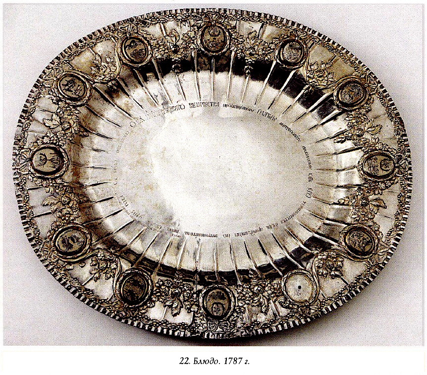 На втором овальном блюде рельефные гирлянды и лавровые венки окружают двенадцать медальонов с черневыми изображениями символов ремесленных цехов (илл. 20, 21). С обратной стороны имеется надпись: «От московских цеховых Ремесленной управы 1787 году июня дня». На лицевой стороне продублирована другая надпись, указывающая, что это блюдо было подарено императрицей 29 июня 1787 года митрополиту Московскому Платону в день его тезоименитства и провозглашения митрополитом. С учетом того, что московская Дворцовая контора могла оказаться в ситуации спешки, благожелательный подарок был особенно необходим. Вместо того чтобы делать специальный заказ, было решено использовать уже имеющееся блюдо, что привело к надписям, выгравированным на нем, и его вручению Платону во время литургии в Успенском соборе Кремля. Реакция самого Платона на такой жест осталась неизвестной.