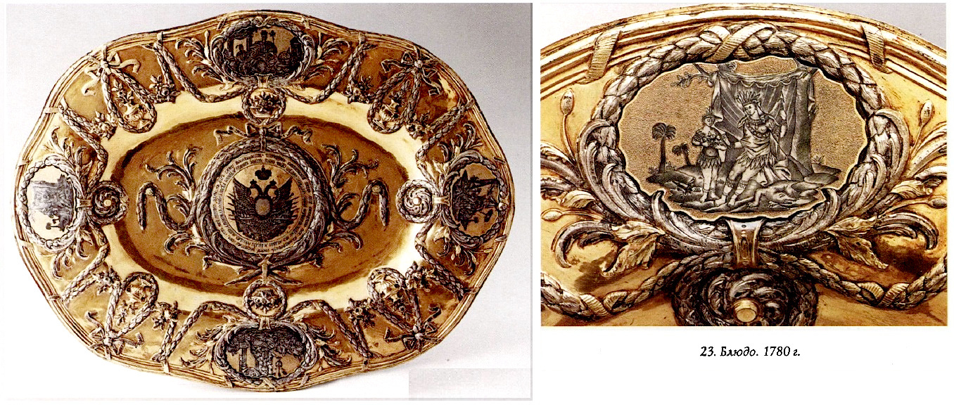 Еще одно из блюд, созданных Ратковым, хранится в запасниках Музеев Кремля (илл. 22). В 1780 году его передали Екатерине II делегаты от жителей Смоленска. Центральный элемент, российский герб — двуглавый орел с пущенной на него пушкой, окружен стихотворной дарственной надписью, в которой восхваляет императрицу, ее мудрость и щедрость: «Блажен Смоленский град лице священно зря, к владычице своей усердием горя от ней прияв дары в дар ей же посвящает, как чисто серебро граждан сердца вручает. Прими их, мудрая и щедра россам мать, Смоленск вовек тебя богиней будет звать».