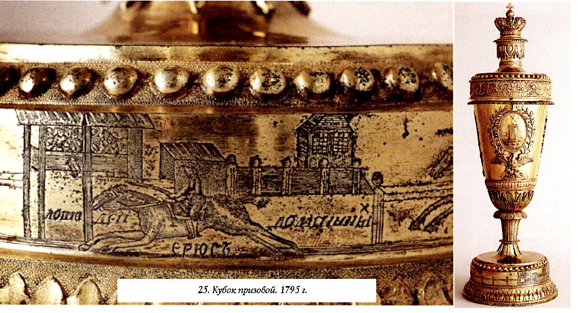 На кубке из Оружейной палаты изысканно выгравированы сцены скачек: семь стремительных коней с жокеями, натянутый вдоль дорожки канат, вышка с судьей на финише и трибуна, полная зрителей. У каждого коня есть имя: Ерюс, Санник, Надежной, Залетной, Лентяй, Газарь и Донкарлус (илл. 25).