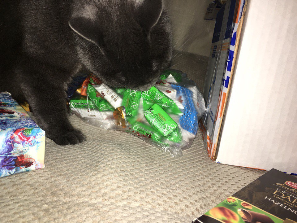 тем временем, пока я распаковывала следующий подарочек, кошка нагло пыталась украсть конфету :D