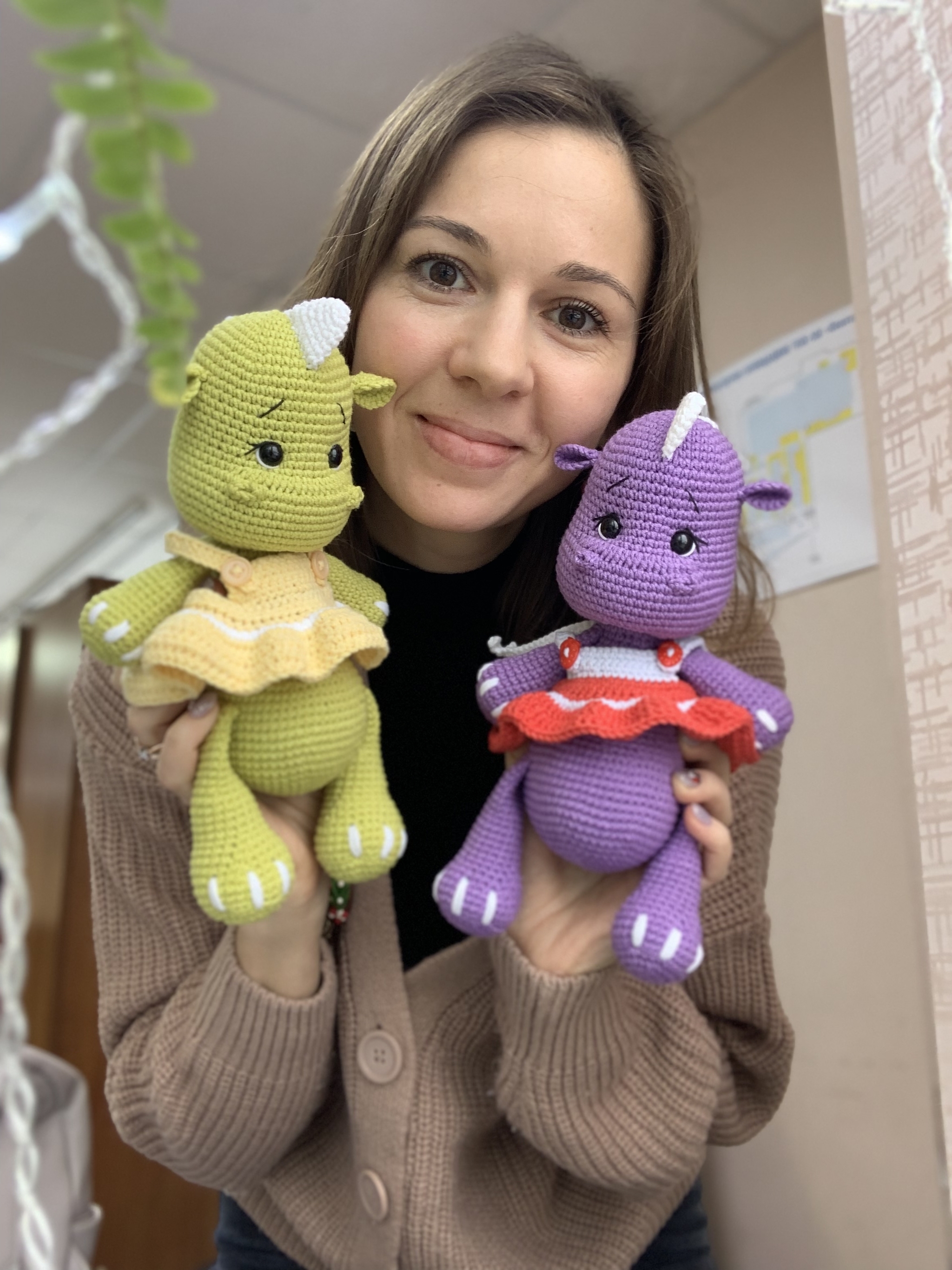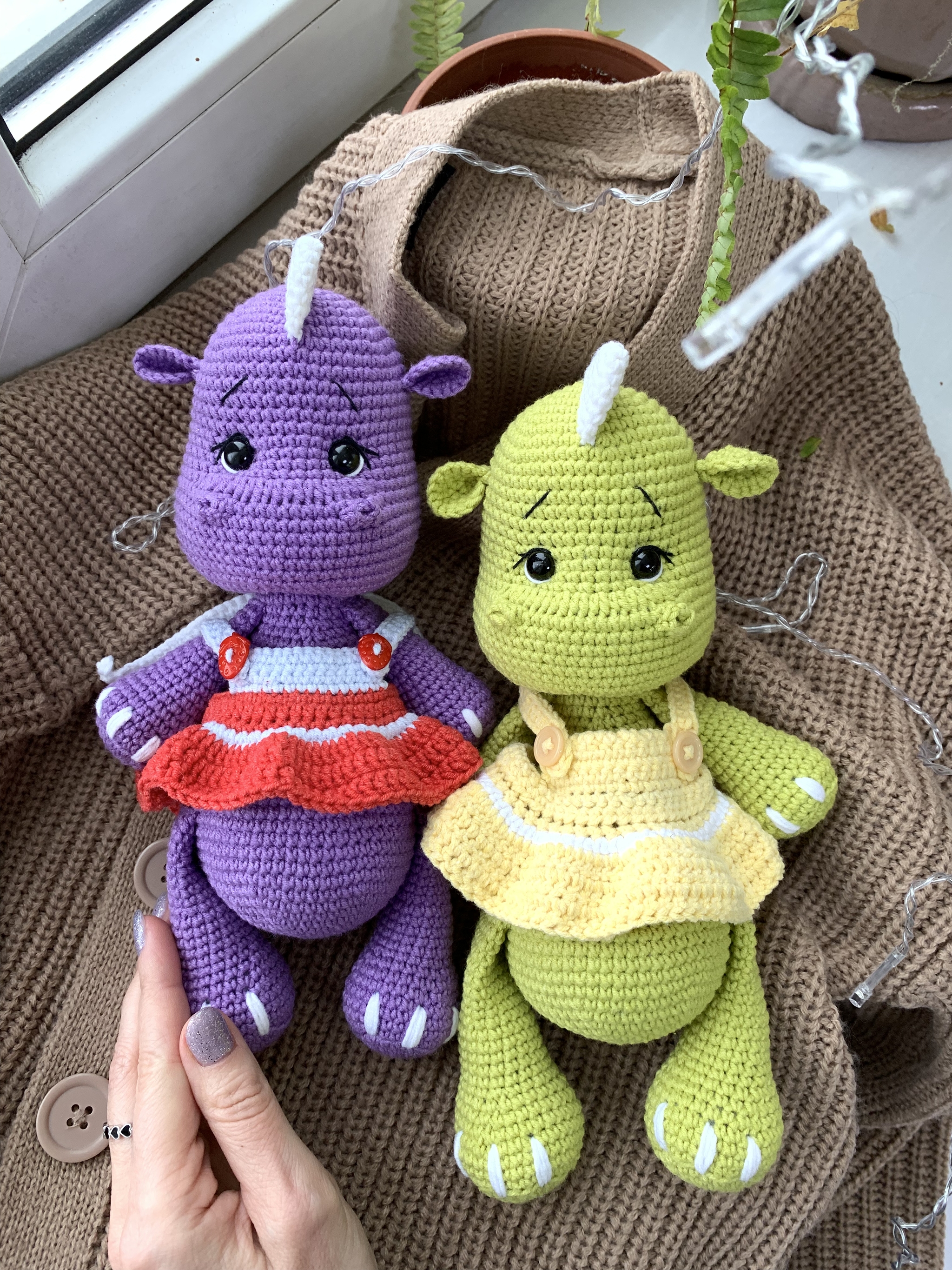 Участвовала в тайном обмене подарков и захотелось мне связать в дополнение символ года - дракошу. Описание этой игрушки давно лежало у меня в хотелках. Когда начала вязать, дочка захотела себе такого же, но фиолетового.