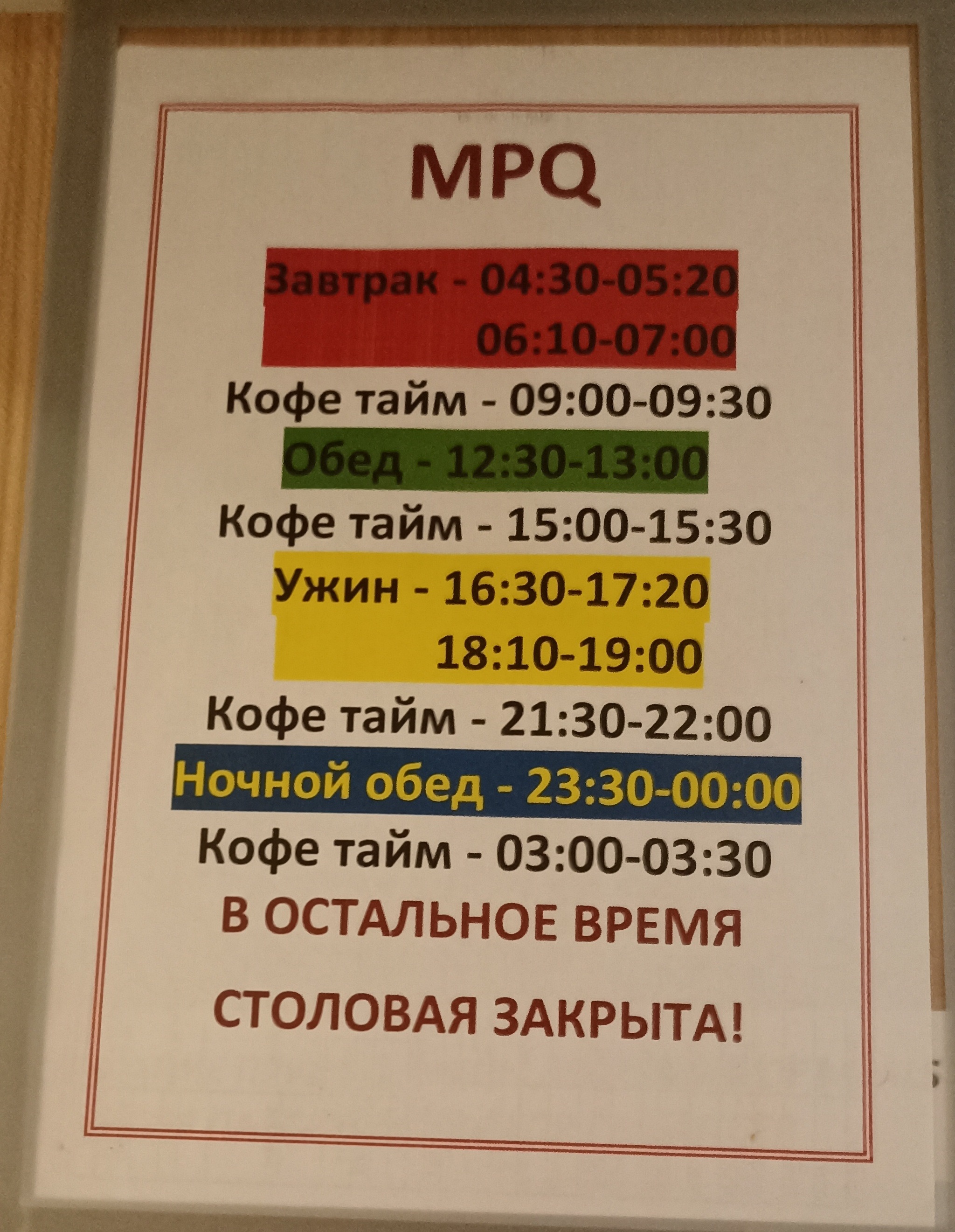 На вахте жесткий распорядок - подъем в 4-6 утра, час на марафет, завтрак, встали построились, форма одежды. Одно спасенье - курилка и кофе-брейк (два получается?)