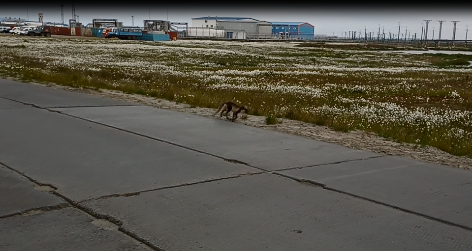 (На фото выше - писец перебегает дорогу (в центре), белое в траве - местные цветочки "пушица". Они как одуваны, только из пуха. Сабетта, территория Ямал СПГ)