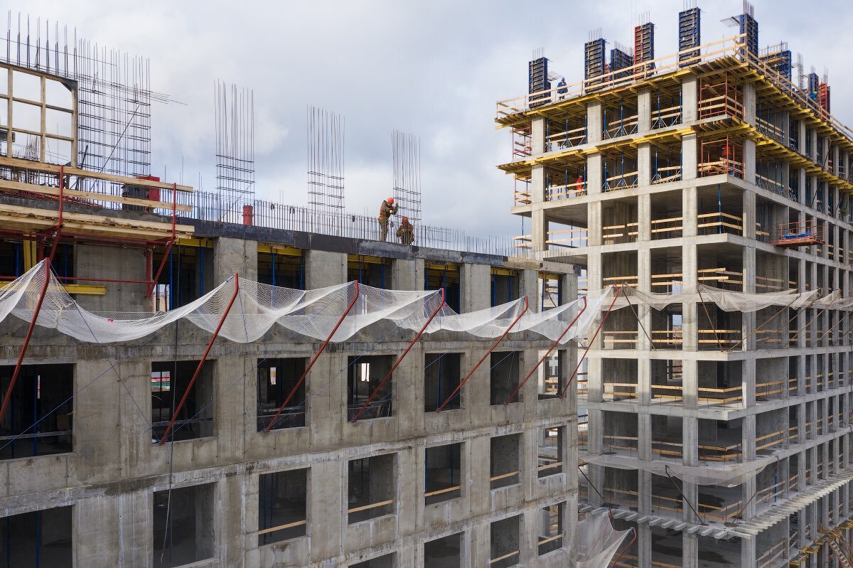 И вишенка на торте: по все му периметру здания натянуты ЗУСы (защитно-улавливающие сетки), которые в случае чего могли бы бедолага спасти. Но юмор в том, что натянуты они на 18 этаже. То есть ровно над головой балансирующего работника.