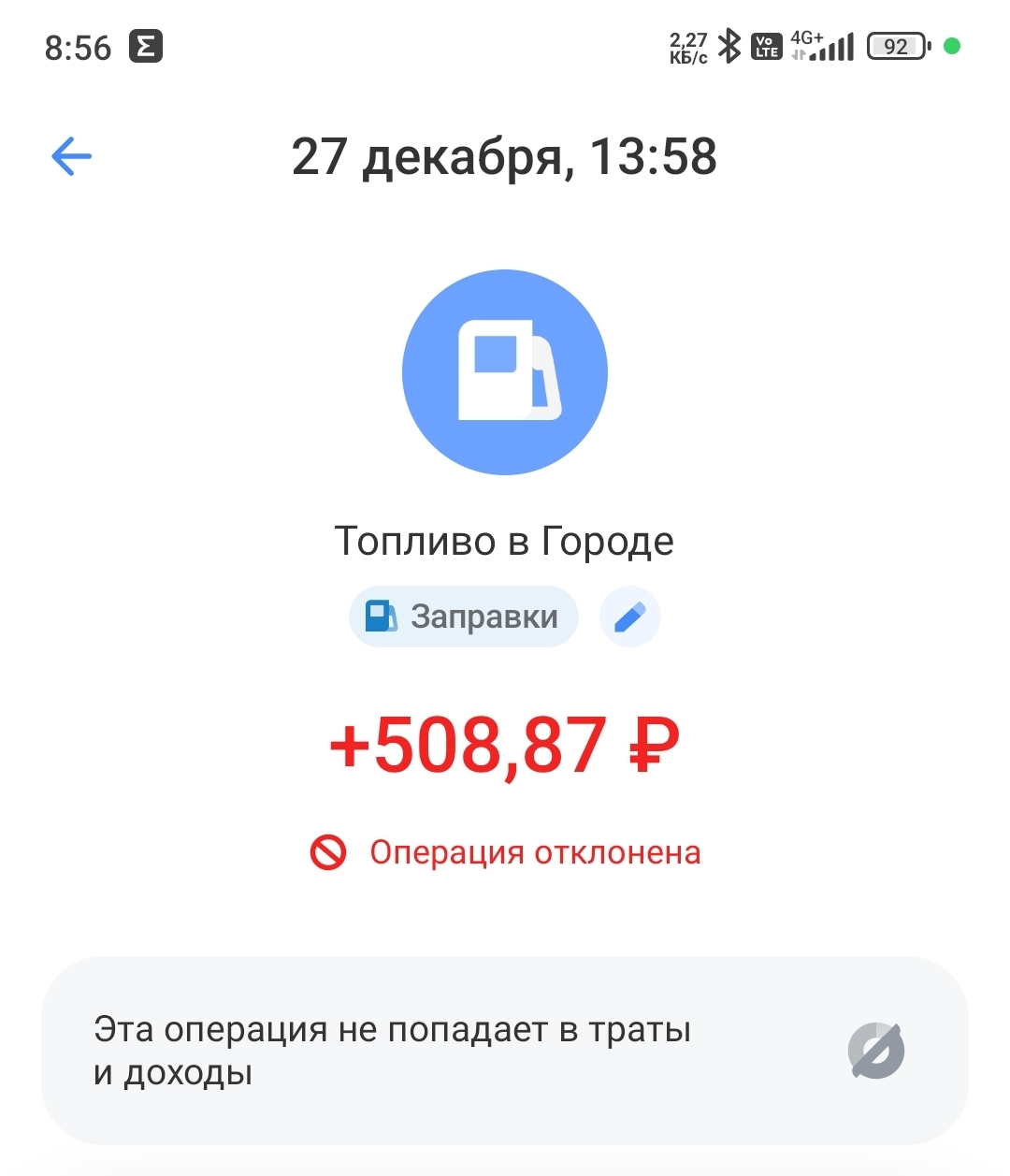 Пытаюсь заправился, выбрал сумму, подождите и "вы отменили заправку". Да ничего я не отменял. Меняем сумму, меняем бензин, ничего не меняется.