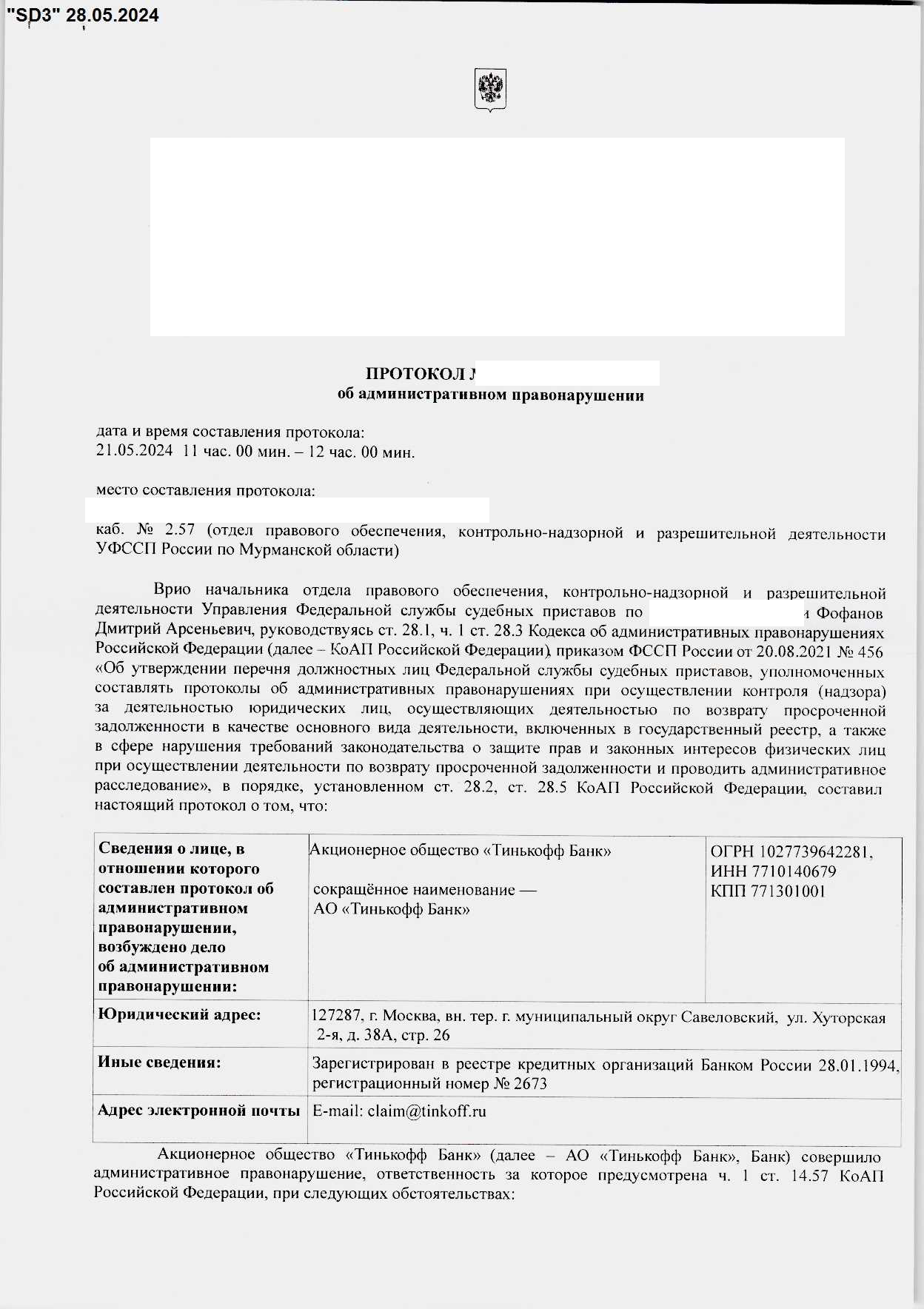 Получив мое обращение, ЦБ переслал его ФССП, а те, в свою очередь, в управление моего региона, которое инициировала расследование, в процессе которого пристав запросил у операторов связи и тинька сведения о номерах, с которых звонили, разные сведения и, все сопоставив и изучив, рождается протокол в отношении главгада по ч. 1 ст. 14.57 КоАП РФ.