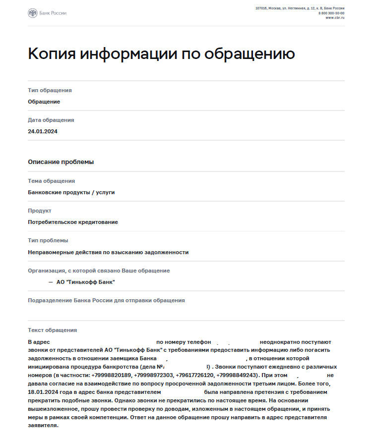 Карточка обращения. Жаловаться можно на самом сайте ЦБ, быстро, удобно. Для интересующихся: не надо сыпать ссылками на законы, как можно проще, чтобы исполнитель уловил о чем речь, они свою работу и без вас знают.