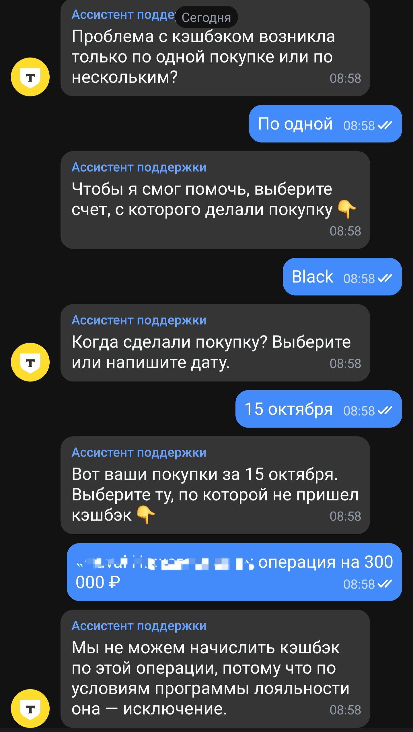 Совершил я покупку. Оплачивал несколькими картами разных банков. И казалось бы. Все банки честно заплатили свой 1% или даже 0,5% кешбека (привет зелёному банку) за обычную категорию. Ну и ладно. Но т-банк как раз всегда. Решил, что в магазинах автомобильных запчастей и автосалонах кешбека не положено. Даже копеек.