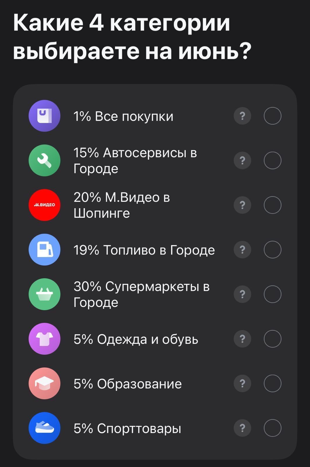 Т-банк предлагает на июнь месяц 4 категории на выбор начиная от 1 % от всех покупок и заканчивая 20 % (в определенном магазине). Заманчивый кешбэк 19 % за топливо и 30 % за покупки в супермаркетов распространяется на покупки в приложении или интернет банке в разделе Город. Если вы решите оплатить покупки в ближайшем супермаркете от дома на кассе, как вы понимаете никаких 30 % вам не будет )