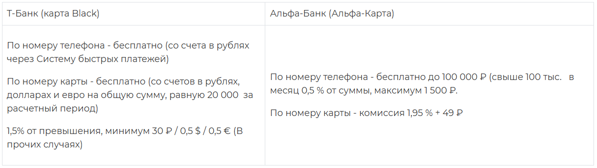 В этом разделе у Т-Банка при переводе другим лицам по номеру карты есть бесплатный лимит до 20 000 ₽, а по Альфе-карте сразу комиссия.