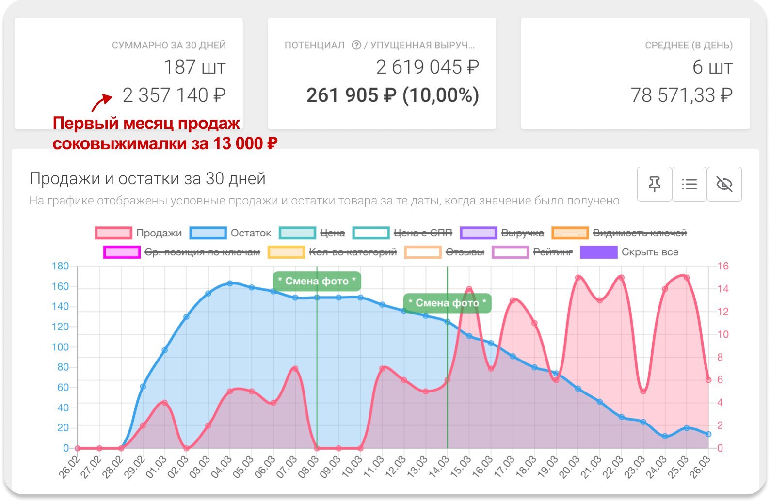 Большинство продавцов уверены, что на WB можно продавать только дешевые товары. Это не так. Продавать дорогие и качественные товары проще, потому что у тебя почти нет конкурентов. Например, мы запускали соковыжималку за 13 000 рублей на WB и продали на 2,5 млн в первый месяц. Ближайший конкурент стоил на 5000 рублей дешевле.