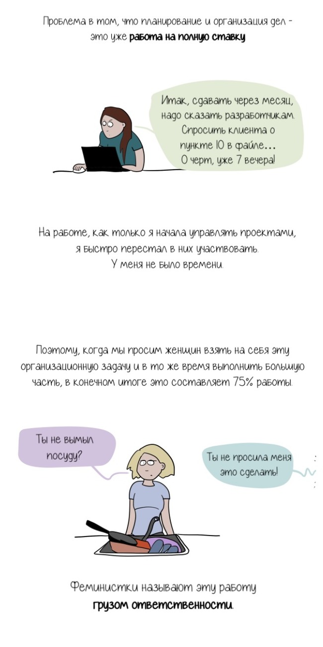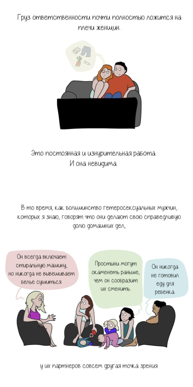 Я никогда не могла правильно подобрать слова, чтобы объяснить, почему так сильно устаю от совместного быта. Даже если мы вроде делили домашние обязанности пополам, я все равно чувствовала себя гораздо более уставшей. В итоге мои попытки объясниться выглядели как разговоры ни о чем или истерики на пустом месте, что расстраивало меня еще больше.