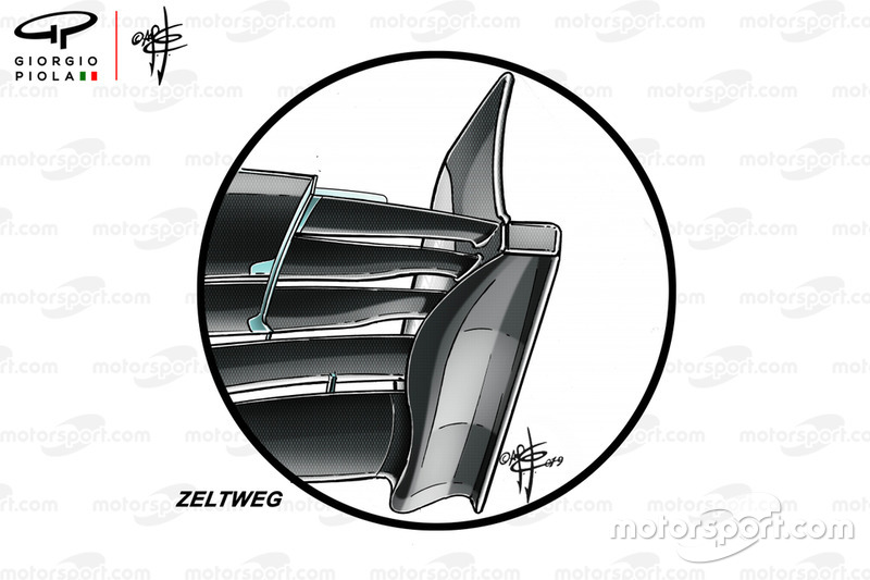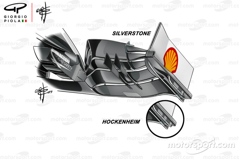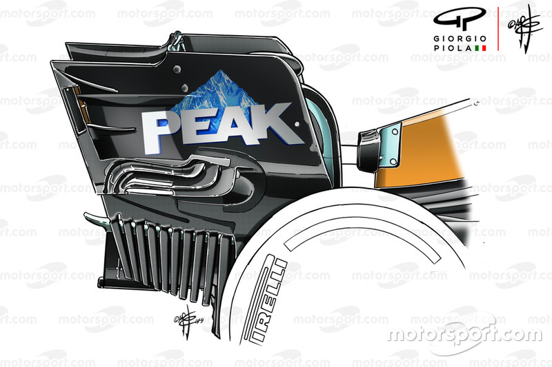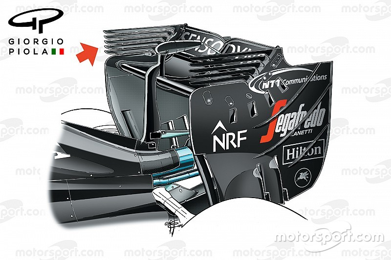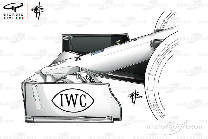 После обновления элемент стал шире, чем прежде, а под ним появился вертикальный бортик. Причем это решение было быстро доработано – если на британском этапе бортик не доходил до переднего края, то уже в Германии стал длиннее. Не исключено, что это связано с особенностями конкретных трасс.