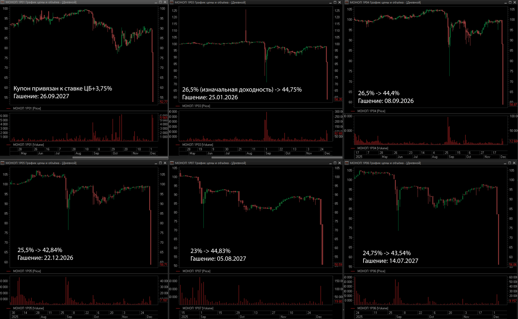 А теперь давайте посмотрим, как техдефолт может резко повлиять на стоимость облигаций. На картинке долговые ценные бумаги той самой АО «Монополия». Их осталось 6 серий. Два последних дня – это четверг и пятница на прошлой неделе. Пост пишется до старта торгов в понедельник. Все они рухнули в район 50-60% от номинала. Во что превратились купонные доходы, написал на графиках. Вместе с датой гашения.
