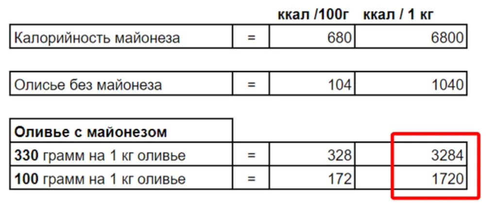 Хороший ориентир для оливье начать с 70г на 1кг. Перемешать, посмотреть, чего-кого и если надо добавлять по 30-40г пока не станет достаточно. Разброс цифр итоговой калорийности — поражает.