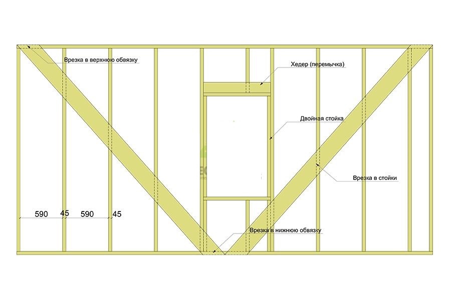 Укосины обязательно должны врезаться в нижнюю и верхнюю обвязку, а не опираться на одну из стоек, иначе смысла в них никакого.