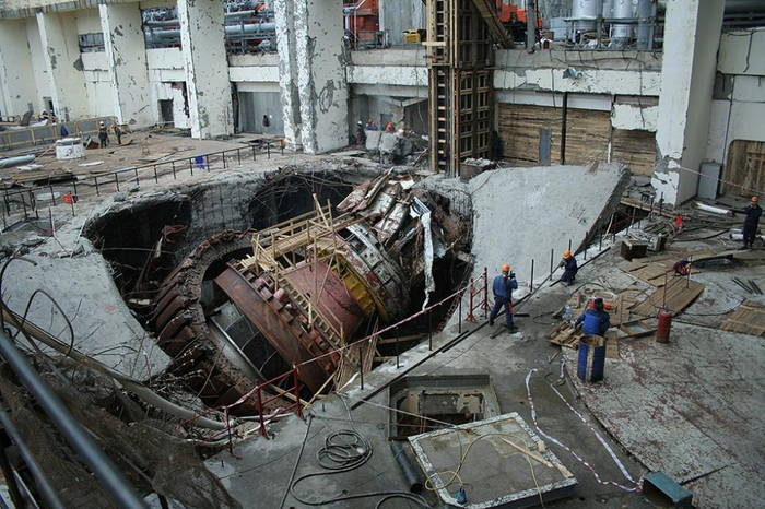 Пожар вызывает падение мощности на Братской ГЭС, и генерация необходимой энергии ложится на Саяно-Шушенскую. ГРАРМ включает в работу проблемную турбину, гоняя её как сучку из режима в режим, заставляя вибрировать. Вибрация разрушает шпильки крышки турбины, в результате чего происходит их обрыв. Крышку срывает, и ротор турбины, глотнув воздуха свободы, начинает резво носиться по залу, круша КЕМ всё на своём пути. Как выглядит ротор видно на фото; напрягите воображение и представьте, как выглядит эта юла в процессе. В результате вся ГЭС оказывается обесточена. Следом за генератором начинает своё чёрное дело вода, быстро, решительно затапливая помещения и выводя из строя оборудование.