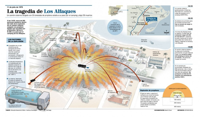 Тем временем в кемпинге Los Alfaques тоже царила безоблачная атмосфера. Солнечная погода, тёплое море, непринуждённая атмосфера. Много семей с детьми, кто-то купался, кто-то загорал – в общем, все наслаждались летним пляжным отдыхом. Вряд ли кто-то обратил пристальное внимание на показавшуюся в полтретьего на дороге автоцистерну. Ехала она по правилам, скорость не превышала, и никто бы и не вспомнил про неё уже через полчаса, но тут послеобеденная идиллия ВНЕЗАПНО была нарушена самым грубым образом.
