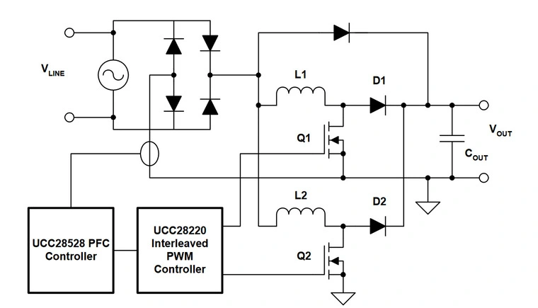 Еще одна интересная технология — Interleaving PFC Pre-Regulator (для просмотра потребуется VPN). В некоторых БП называется Boost Interleaved PFC. Например у XPG CyberCore 1300 Platimun на платформе CWT CST. Вместо одного boost-конвертера, который играет роль корректора мощности (PFC) ставят два параллельно со сдвигом 180°.