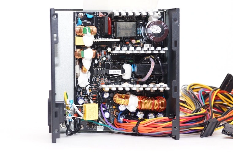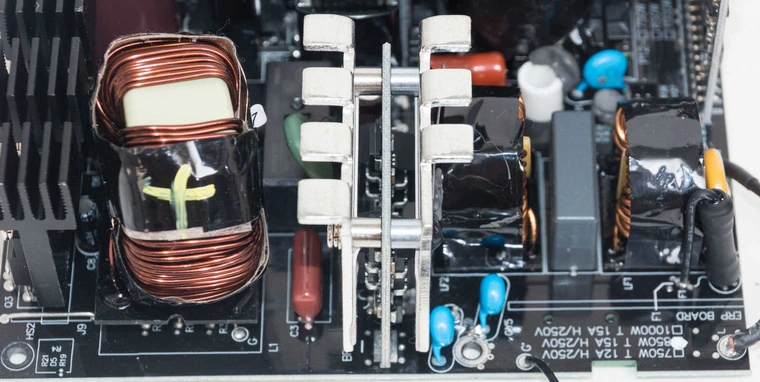 Чтобы попадать в требования 80 PLUS, производителям приходится разрабатывать максимально эффективную схемотехнику и применять при сборке компоненты с минимальным паразитным сопротивлением. Каждый лишний Ом в цепи преобразования — это дополнительные ватты электрической энергии, которые не дают ничего, кроме бесполезного нагрева. Если взять блок с обычным «неметаллическим» сертификатом или вообще без, то скорее всего перед нами динозавр. Простой как пень, на классической схеме без резонансного преобразователя LLC, с выпрямителем на диодах (шоттки в лучшем случае), трансформатор с отдельными обмотками на +5 и +3,3 вольта, которые стабилизируются старыми добрыми магнитными усилителями на катушках, иногда даже групповых.